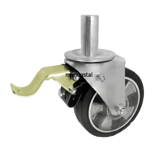 Obudowa skrętna z trzpieniem koła tworzywowego poliamidowo-poliuretanowewgo wykonana jest ze stalowych elementów tłoczonych, łożyskowana podwójnym rzędem kulek w głowicy skrętnej. Kulki łożyska wypełnione są długotrwałym smarem i są zabezpieczone przez odpowiedni kształt płyty górnej. Koło osadzone jest w niej na tulejce, montowane z kielichem obudowy za pomocą śruby i nakrętki. Centralnie umieszczony trzpień jest solidny, stalowy, znitowany ruchowo z obudową. Hamulec mechaniczny blokuje koło za pomocą mocnego mechanizmu, posiada śrubę regulacyjną, za pomocą której można regulować siłę hamowania.
