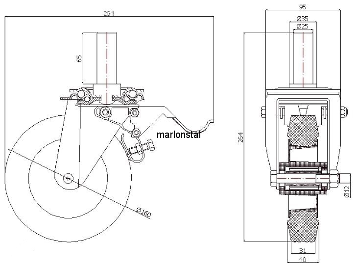 Obudowa koła wykonana jest ze stalowych elementów tłoczonych. Koło występujące w tej obudowie osadzone jest na tulejce, montowane jest z kielichem obudowy za pomocą śruby i nakrętki. Obudowa jest łożyskowana podwójnym rzędem kulek w głowicy skrętnej. Kulki łożyska wypełnione są długotrwałym smarem i zabezpieczone przez odpowiedni kształt płyty górnej. Solidny, stalowy, umieszczony centralnie trzpień znitowany jest ruchowo z obudową koła. Obudowa wyposażona jest w hamulec mechaniczny, który blokuje koło i głowicę skrętną za pomocą bardzo mocnego mechanizmu. Dodatkowo posiada on śrubę regulacyjną za pomocą, której można regulować siłę hamowania.
