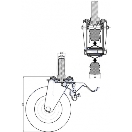 Obudowa koła wykonana jest ze stalowych elementów tłoczonych. Koło występujące w tej obudowie osadzone jest na tulejce, montowane jest z kielichem obudowy za pomocą śruby i nakrętki. Obudowa jest łożyskowana podwójnym rzędem kulek w głowicy skrętnej. Kulki łożyska wypełnione są długotrwałym smarem i zabezpieczone przez odpowiedni kształt płyty górnej. Solidny, stalowy, umieszczony centralnie trzpień znitowany jest ruchowo z obudową koła. Obudowa wyposażona jest w hamulec mechaniczny, który blokuje koło i głowicę skrętną za pomocą bardzo mocnego mechanizmu. Dodatkowo posiada on śrubę regulacyjną za pomocą, której można regulować siłę hamowania.